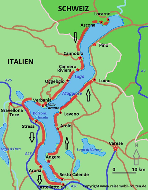 Beim Urlaub am Lago Maggiore erlebt der Reisemobilist „Bella Italia“ bereits in der Schweiz! Der nördliche Teil des rund 64 Kilometer langen Sees liegt im schweizerischen Tessin. Hier versprühen die herausgeputzten Städte Locarno und Ascona italienischen Charme. Man flaniert über schöne Promenaden vorbei an Palmen und blickt über den See, der im nördlichen Teil von hohen Bergen flankiert wird. Es macht Spaß ohne Hektik am Ufer des Sees entlang zu fahren und die herrlichen Städte, die schönen Inseln und schließlich die vielen farbenprächtigen Parkanlagen zu besuchen. Freude bereiten auch die guten Camping- und Stellplätze (3), das Angebot an Badeplätzen und die Wassersportmöglichkeiten. Wer sich und seinem Fahrzeug etwas Ruhe gönnen möchte, sollte sich ein Ticket für die Ausflugsschiffe kaufen. Der Blick von der Seeseite auf die Inseln und Städte ist fantastisch. Die Route beginnt im Norden mit dem Besuch der mondänen Städte Locarno und Ascona. Mit der Grenzüberfahrt wird die Reise schlagartig günstiger. Der Ort Cannero Riviera (4) lockt mit einem guten gastronomischen Angebot zu erschwinglichen Preisen, einer verwinkelten Altstadt und einer gepflegter Uferpromenade.